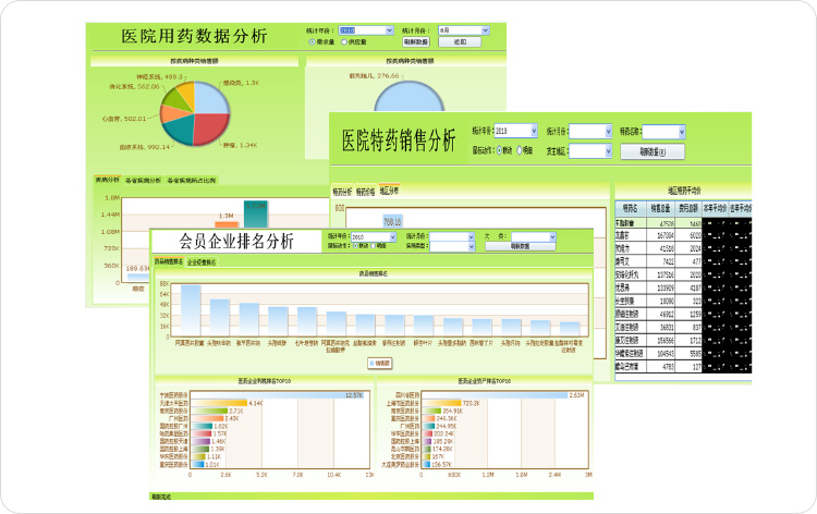 主要功能: 數(shù)據(jù)是為應(yīng)用服務(wù)的,在藥品信息云服務(wù)平臺上的大量藥品信息及流通數(shù)據(jù)是平臺的核心,通過對大數(shù)據(jù)的挖掘分析,形成分析報表、經(jīng)營指標(biāo)等,提供給行業(yè)和企業(yè)服務(wù),包括行業(yè)分析、藥品分析、區(qū)域分析、企業(yè)分析、合理用藥分析等等